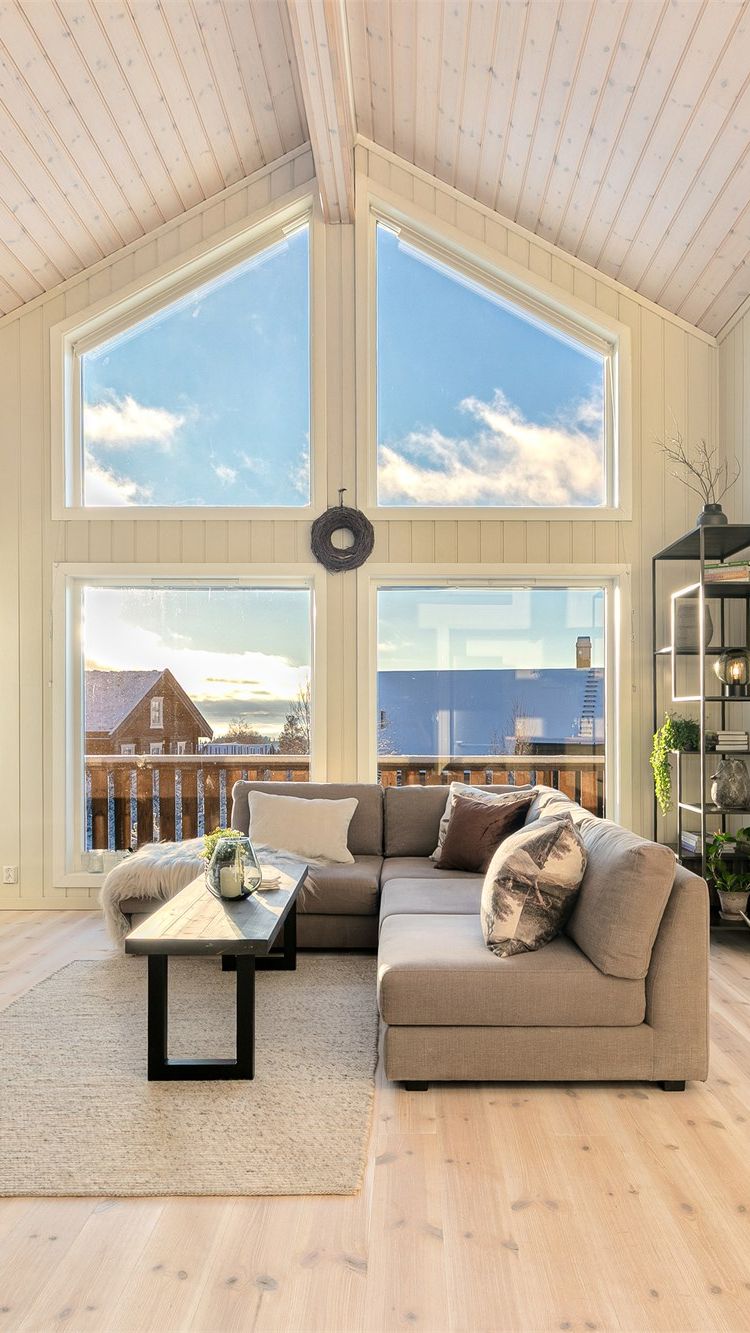Sammen med kjøkkenet danner stuen et stort allrom med avdelte soner. Atmosfæren er lun og god, og bidrar til å skape et koselig tilholdssted for familiehygge med sosiale middager.