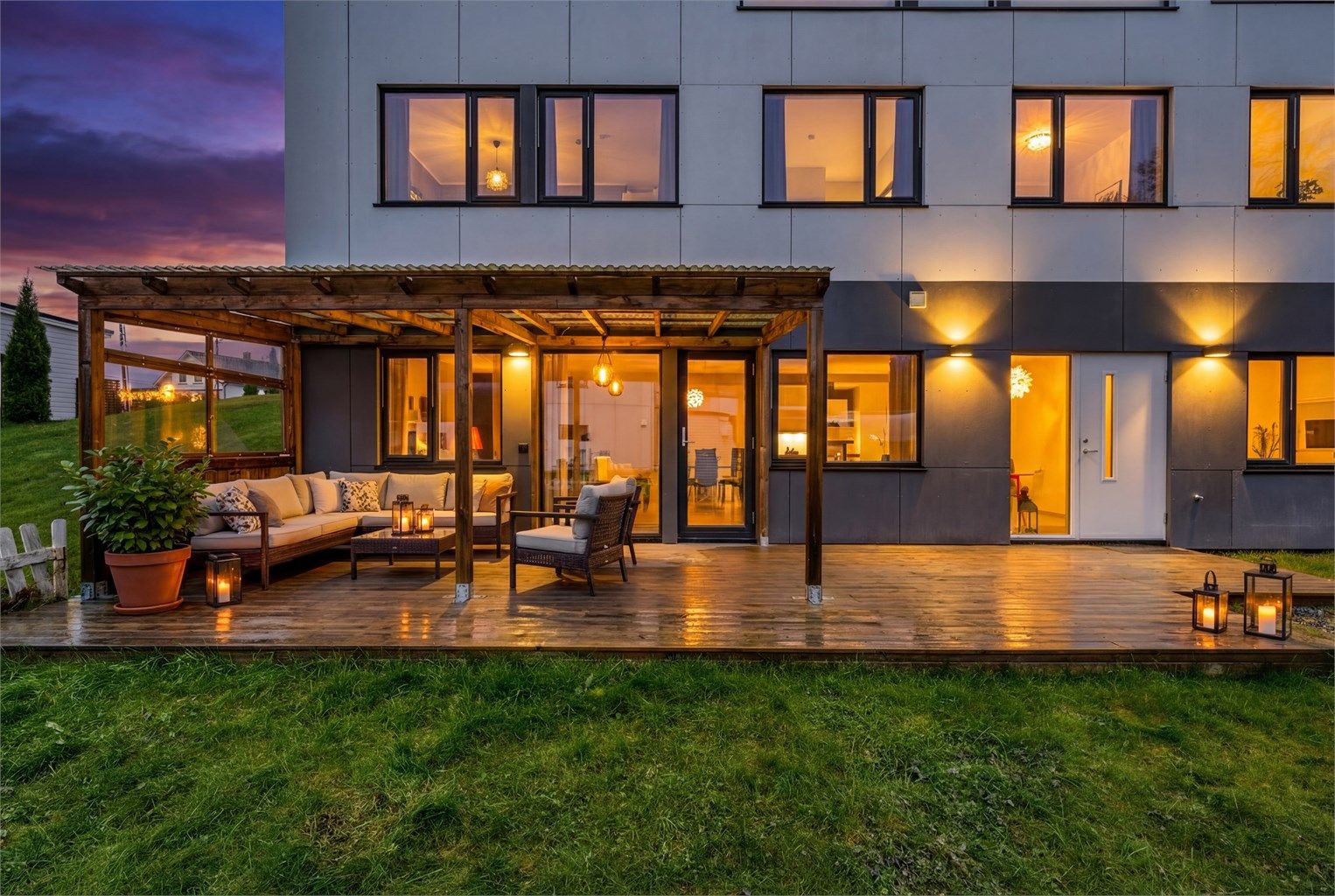 Fra stuen er det utgang til en flott og romslig terrasse på ca. 29 kvm – en herlig uteplass som fungerer som en naturlig forlengelse av stuen på sommerstid.