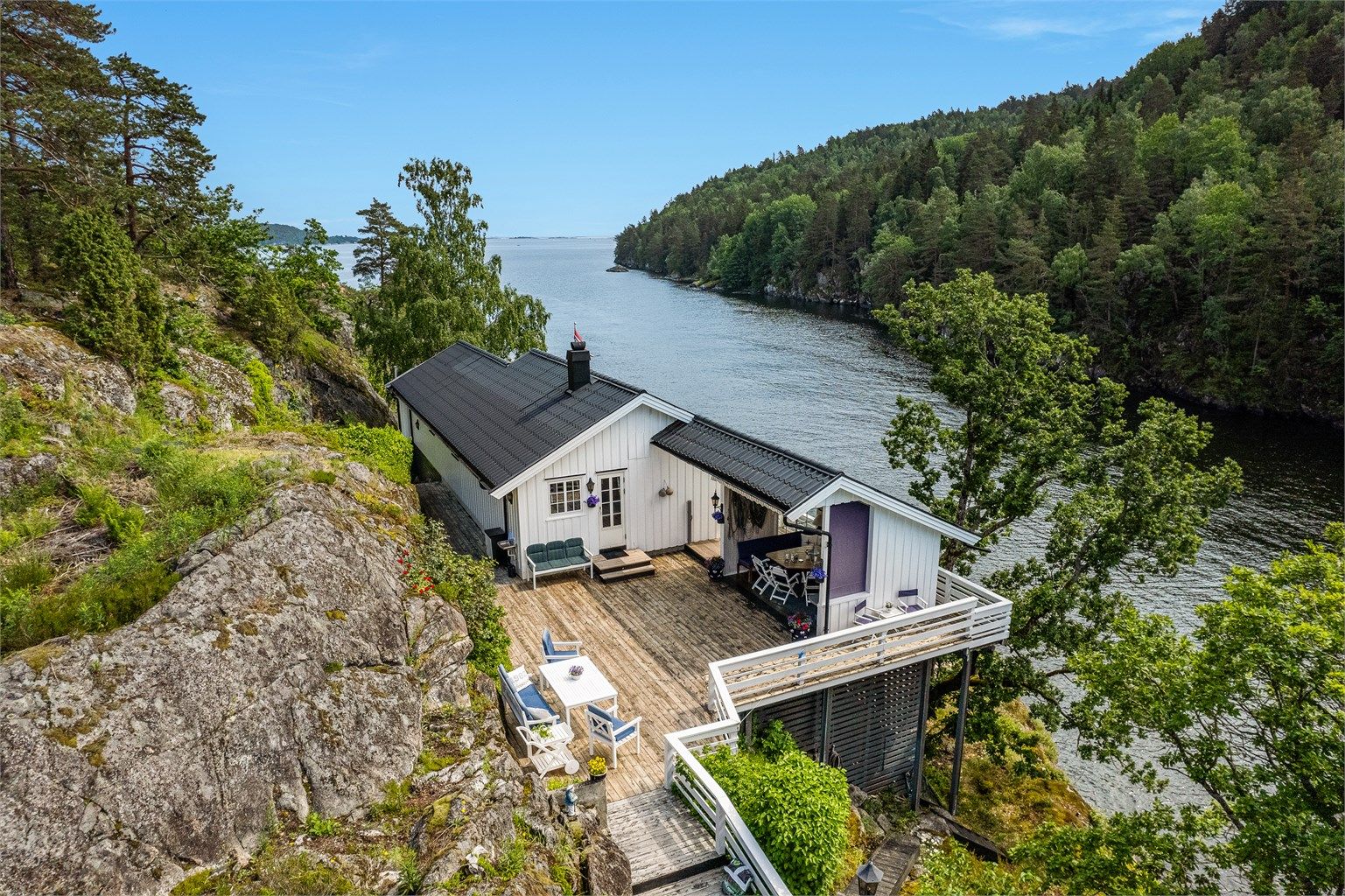 På Risøy rett uten for Valle i Kragerø kommune, ligger denne hytta, usjenert og skjermet for vær og vind. Når du kommer til eiendommen går du i land på en stor brygge med gode dybdeforhold. Her fører en bred trapp opp til hytta, med terrasse på over 140 kvm, som strekker seg rundt hele bygningskroppen, samt en overbygget utestue. Selve hytta er på 82 kvm. Pluss et uthus på 5 kvm.