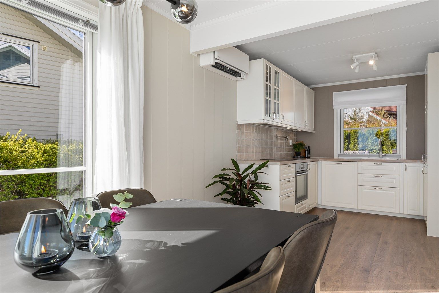 Pen og velholdt tomannsbolig over 2 plan. Romslig og åpen planløsning i 1.etg mellom stue og kjøkken. Her er det godt med plass til sofa, spisebord og tv. Store vindusflater i stuen som gir deg utsikt ut over flott natur. Ut fra stuen kan du gå rett ut på terrassen og nyte gode solforhold. På terrasse er det bod på 7kvm med god plass til oppbevaring av sportsutstyr og alt du skulle trenge.