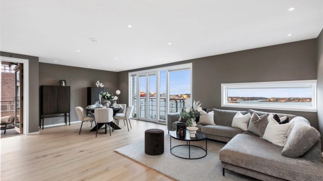 Gjennomført og stilfull leilighet med høy standard |Perfekt beliggenhet i blokken |Nydelig sjøutsikt |Heis og parkering
