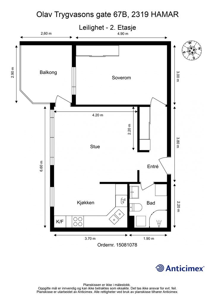 Vedlagte plantegninger er ikke målbare. De oppgitte arealer er hentet fra rapport med befaringsdato 07.04.2026 utført av Anticimex v/Marius Hasselknipe Olsby. Arealene er beregnet og rom er definert etter dagens faktiske bruk, uavhengig av hva som er godkjent av bygningsmyndighetene.