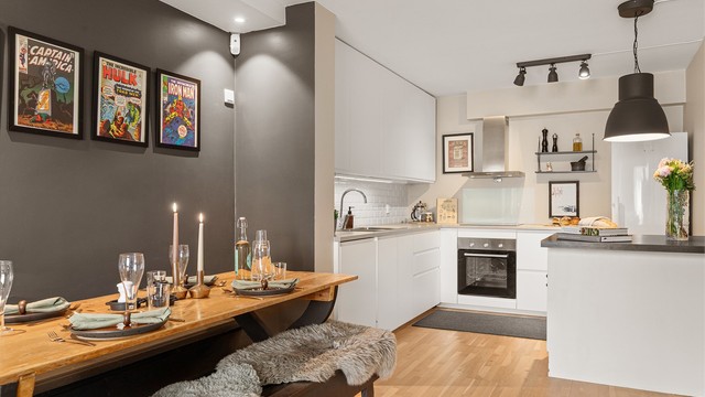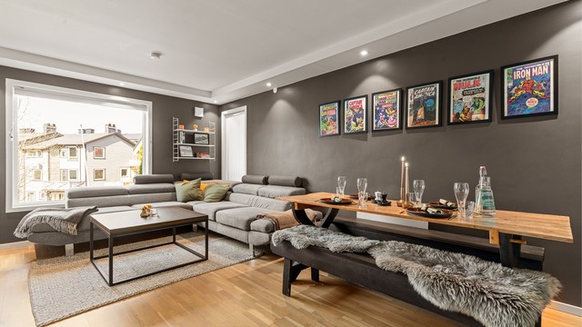 Romslig stue malt i mørke toner og med åpen løsning mot kjøkkenet. Det slippes inn rikelig med naturlig lys fra det store vinduet og det er en peisovnen fra byggeår plassert sentralt i stuen. Det er god plass til både en sofagruppe og et spisebord.