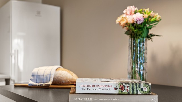 Lyst kjøkken innredet med over- og underskap i glatte, hvite fronter og laminert benkeplate. Det har integrert stekeovn, platetopp og oppvaskmaskin samt. en praktisk kjøkkenøy mot stuen for ekstra benke- og oppbevaringsplass.