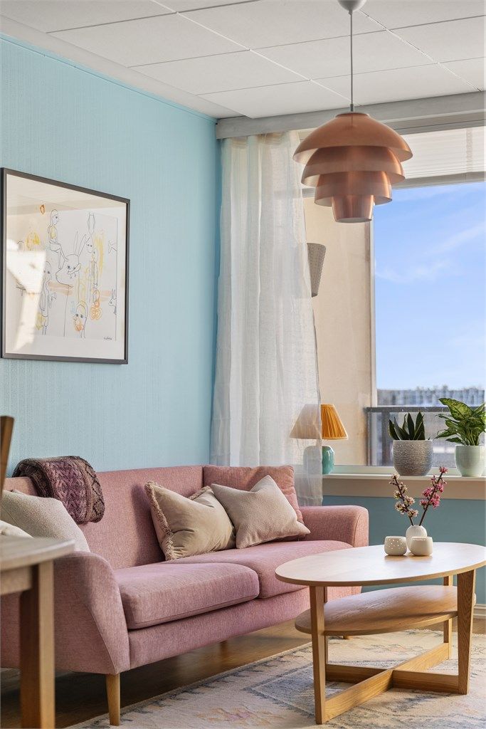 - Stuen er lett å møblere og byr på god plass til både sofagruppe og spisebord. Store vindusflater gir rikelig med naturlig lys Herfra har du også utgang til en solrik balkong med god plass til utemøbler.