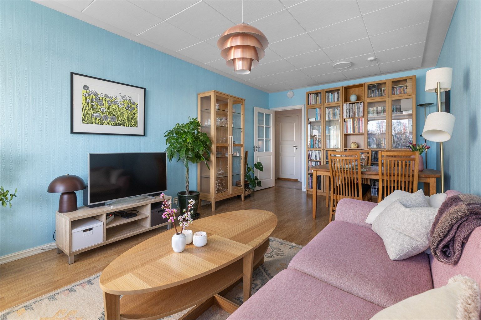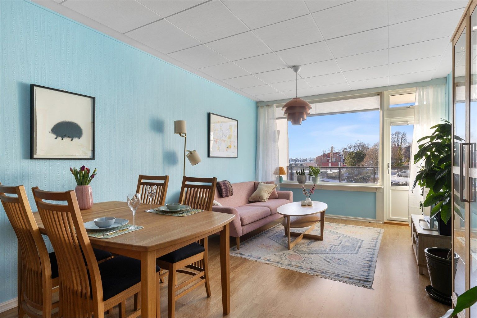 - Romslig og lys stue med rom for både sofagruppe og spisebord.