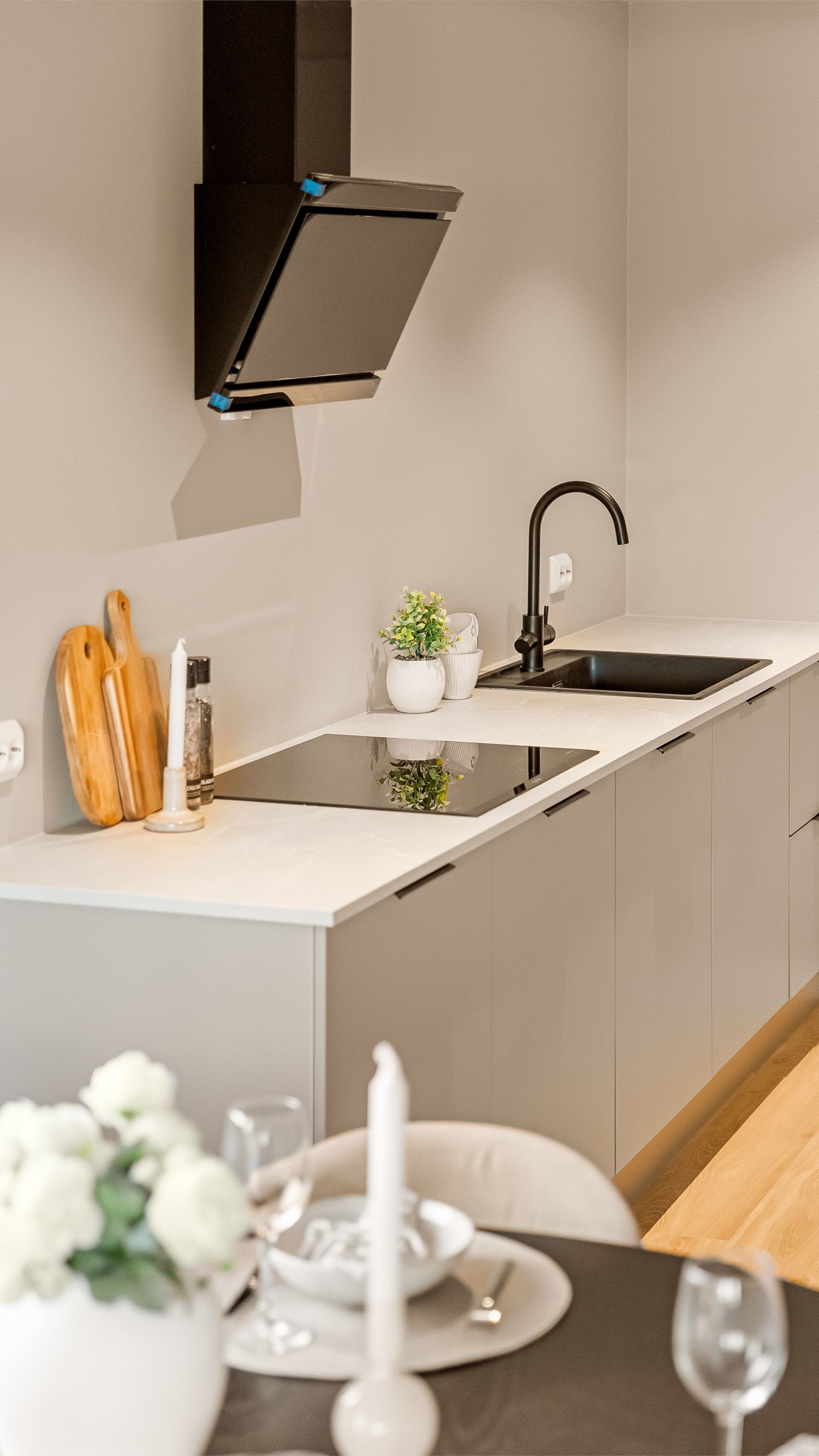 Det åpne kjøkkenet har lysegrå, slette fronter og rikelig med skap- og benkeplass. Her er det lagt til rette for matlaging og sosialt samvær, og integrerte hvitevarer er inkludert.