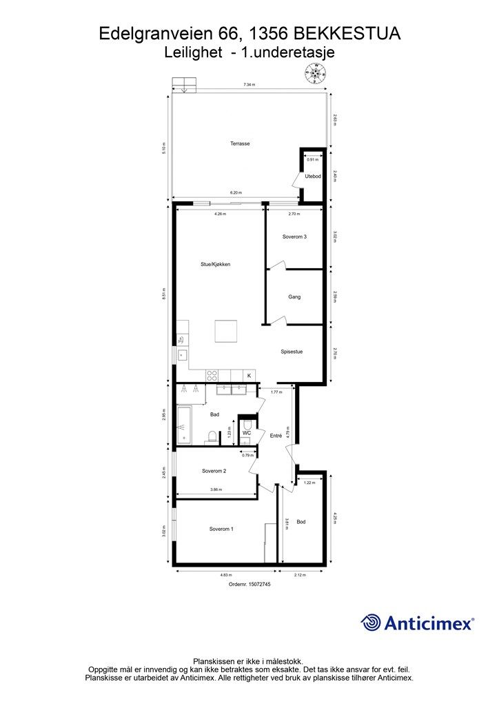 1 underetasje: Entré, bad, gang, stue/kjøkken, tre soverom, toalettrom og innvendig bod