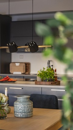 Stor og lys stue som ligger i åpen løsning med kjøkkenet. Her er det store vindusflater som åpner opp rommet og slipper inn rikelig med dagslys. I stuen er det god plass til å møblere i flere soner med sofagrupper og spisegruppe. Kjøkkenet er oppgradert og praktisk innredet med langvegg med over- og underskap og en stor kjøkkenøy som gir ekstra benkeplass samtidig som den fungerer som en herlig romdeler. Kjøkkenet har en kombinasjon av delikate, mørke fronte med benkeplate i laminat som står i stil med resten av kjøkkenet. Fra leilighetens hoveddør er det enkel og direkte adkomst til kjøkkenet via boden. Dette gir en svært praktisk løsning, der man enkelt kan sette fra seg og bære inn matvarer direkte etter handling.