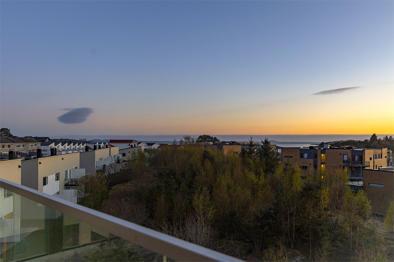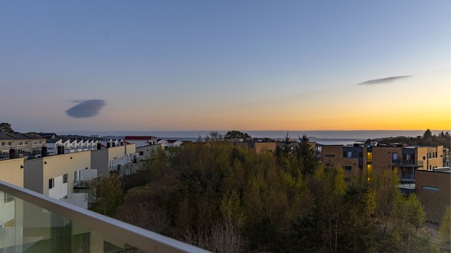 Fra stuen har man utgang til en romslig, solrik og overbygd balkong på ca. 23 m² med integrerte spotter i taket som gir en hyggelig atmosfære på kveldstid. Balkongen har god plass til å møbleres med både sittegruppe og grill, og fungerer som en naturlig forlengelse av stuen i sommerhalvåret. Her kan man nyte flott sjøutsikt og lange, lyse kvelder i kveldssolen.