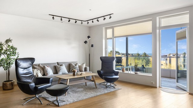Elegant 3-roms leilighet m/sjøutsikt og gode kvaliteter| Balkong ca. 23 kvm| 2 p-plasser m/elbillader| Heis| IN-ordning.