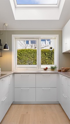 Åpen stue-/kjøkkenløsning med god soneinndeling. Rommet er gjennomgående med svært gode lysforhold. Kjøkkenet er fra kvalitetsleverandøren Kvik og var nytt i 2017, med matte hvite fronter, integrerte hvitevarer og benkeplate med nedfelt oppvaskkum. Kjøkkenet er svært godt utnyttet med både skap og benkeplass, og har en fin barløsning med plass til to stoler i enden av benkeplaten. I tilknytning til kjøkkenet er det plass til stort spisebord. Kjøkken og stue har gulvvarme.