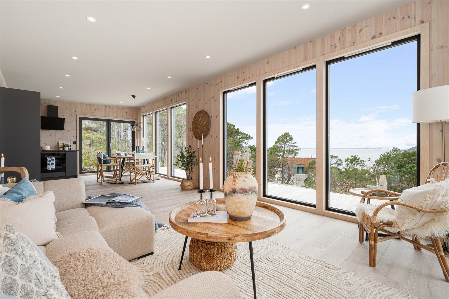 Velkommen til Trollvikhammaren 39 - En idyllisk eiendom med nyoppført funkishytte Eiendommen ligger skjermet til, med panoramavinduer, fantastisk sjøutsikt og meget gode solforhold.