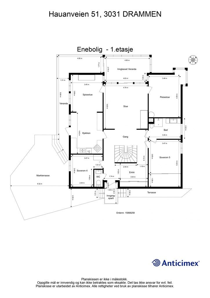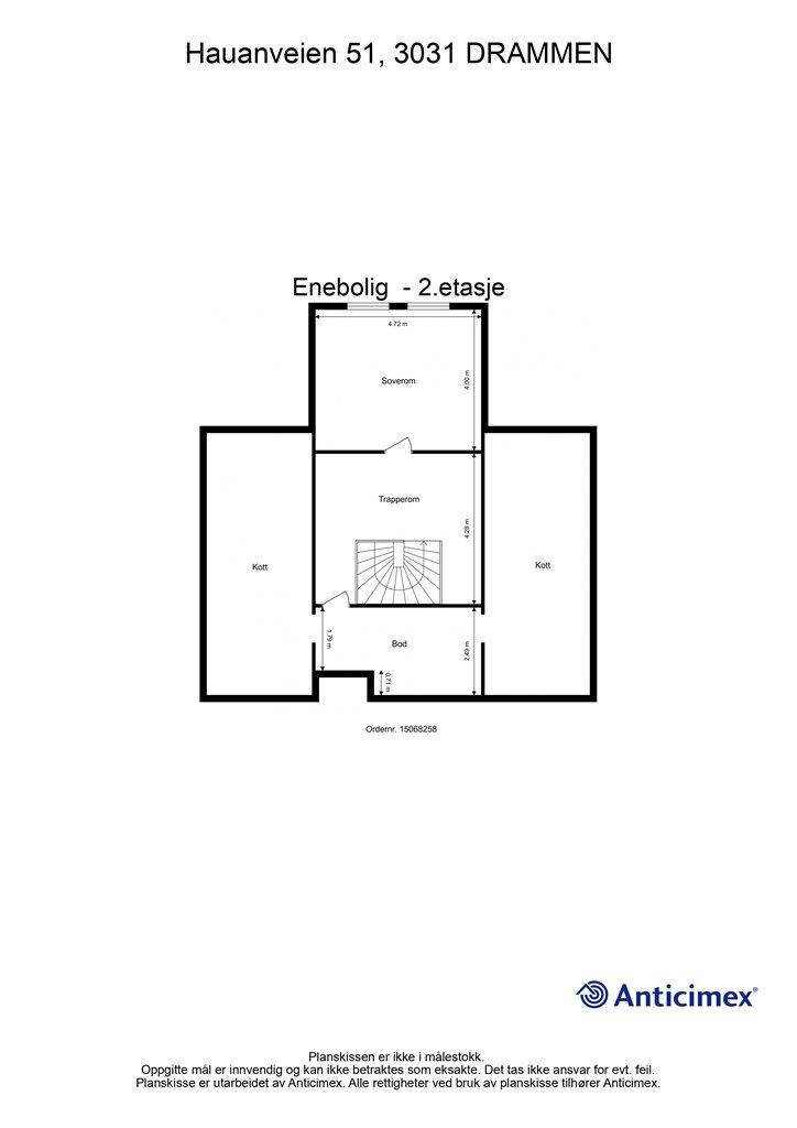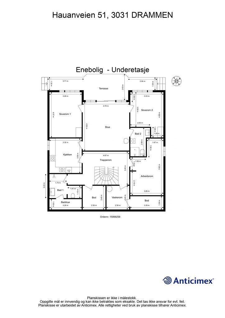 Vedlagte plantegninger er ikke målbare. De oppgitte arealer er hentet fra rapport med befaringsdato 17.03.2025 utført av Anticimex AS. Arealene er beregnet og rom er definert etter dagens faktiske bruk, uavhengig av hva som er godkjent av bygningsmyndighetene.