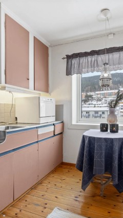 - Kjøkken: Det er valgt å vurdere kjøkkenet (og tilhørende bygningsdeler) med en samlet helhetsvurdering. Følgende hovedmomenter er lagt til grunn for vurderingen. Himlingsflater bærer preg av aldersrelatert slitasje og har enkelte mindre skader. Veggflater bærer preg av aldersrelatert slitasje og har enkelte mindre skader. Synlige deler av gulvets overflatematerialer bærer preg av slitasje og enkelte skader. Ukjent om ventilatoren gir tilstrekkelig avtrekk, ved funksjonstest registreres liten effekt. Innredningen bærer i sin helhet preg av høy slitasje og skader.