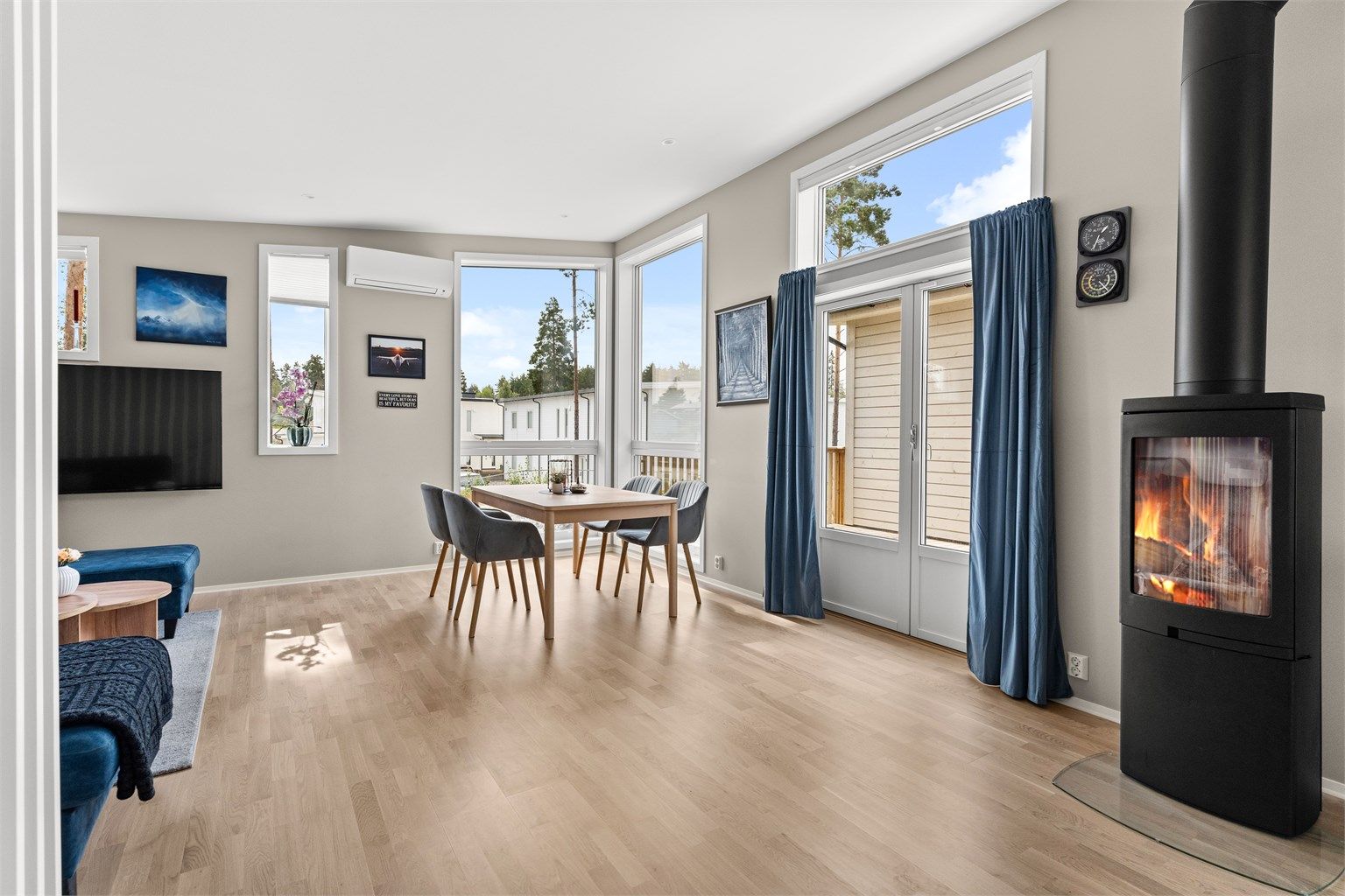 Innvendig har boligen et moderne farge- og materialutvalg. Stuen har romslig takhøyde og store vindusflater, i åpen løsning med kjøkkenet. Det er baderom i første etasje, samt toalettrom i andre etasje. Med hele 3 soverom er denne boligen den perfekte størrelse for en familie. Gode lagringsmuligheter i bodrom ute og inne. Boligen er påkostet med bla. el-lader, asfaltert innkjørsel, varmepumpe, pergola, innvendig lysskjerming (plissé) mm.