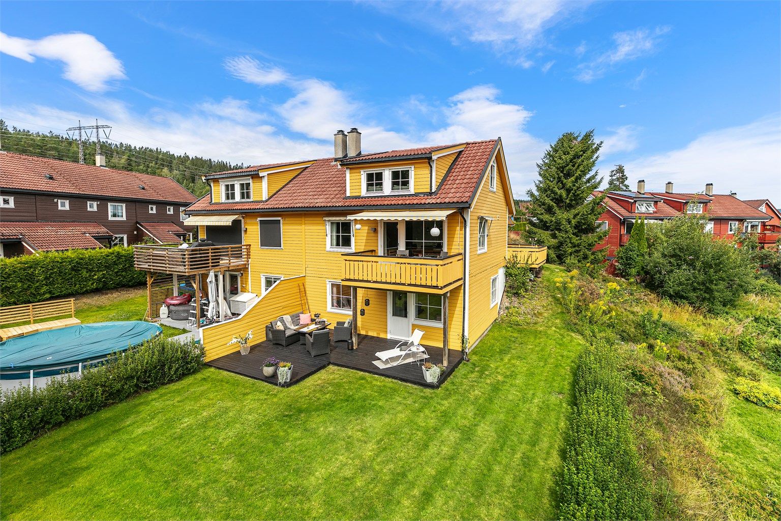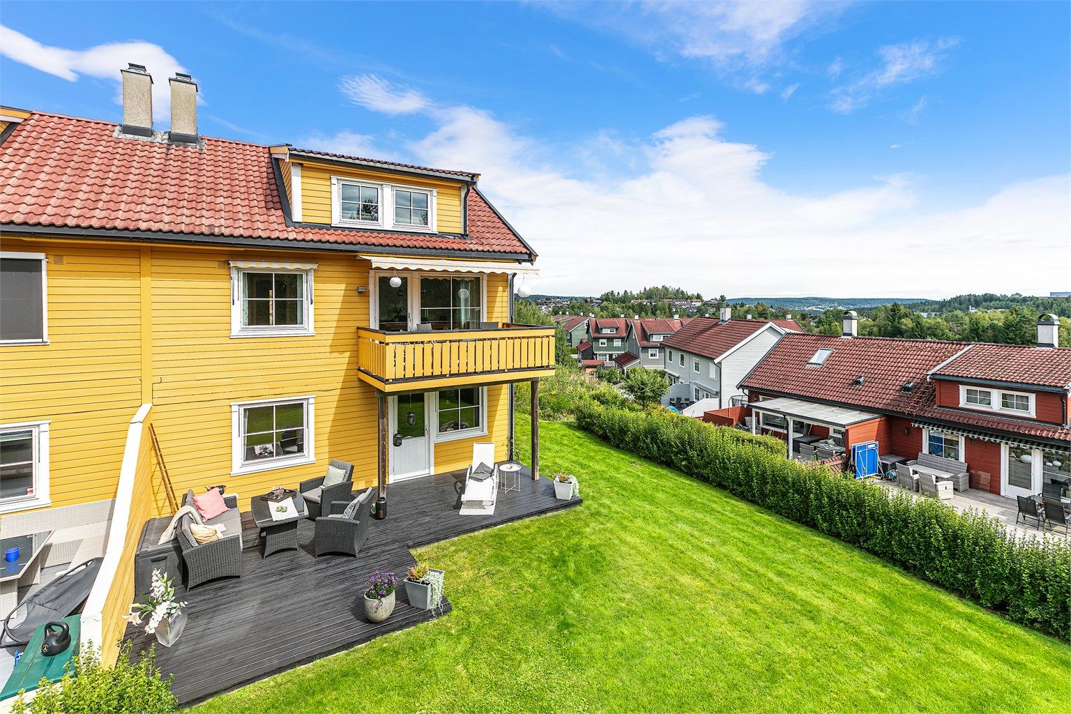 Familievennlig halvpart av tomannsbolig, med garasje, usjenert hage, flott utsikt og solrike uteplasser.