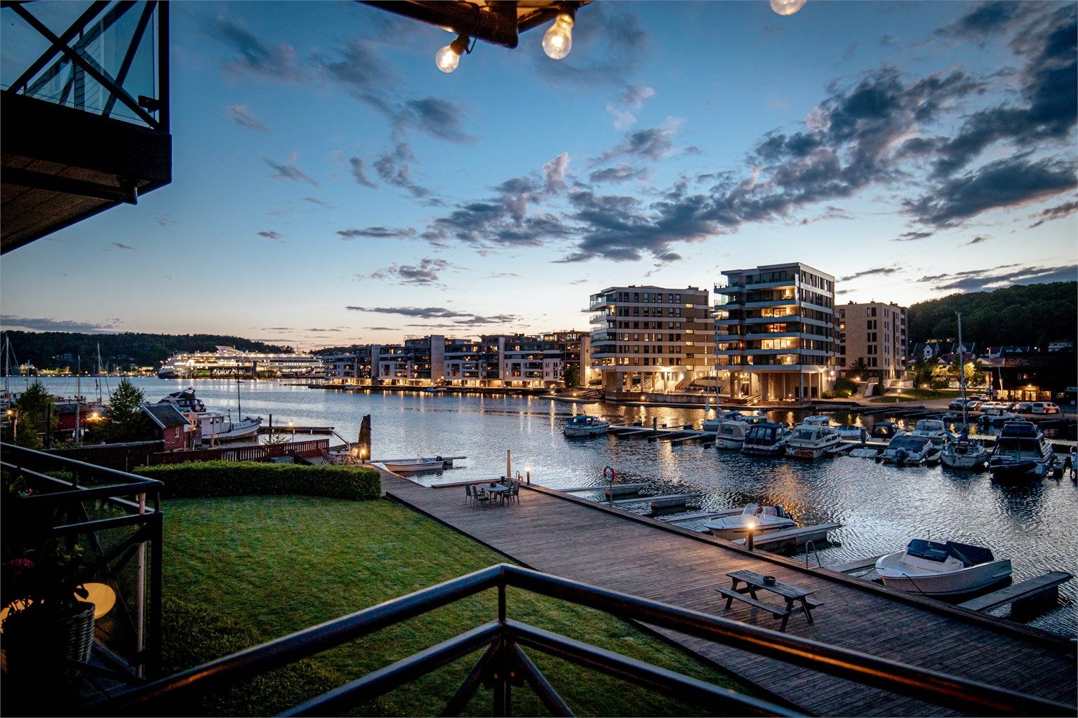 Her bor du flott til i 2. etasje med nydelig utsikt over havnebassenget og mot selve bykjernen. Hjørneleiligheten er lys og trivelig innredet med utgang til balkong med kveldssol. Ypperlig for varme sommerkvelder. Det medfølger båtplass og bryggeanlegget er tilrettelagt med både sittegrupper til felles bruk og benker, dusj, badestige og strøm. Parkering i egen frittliggende garasje. Velkommen til visning.