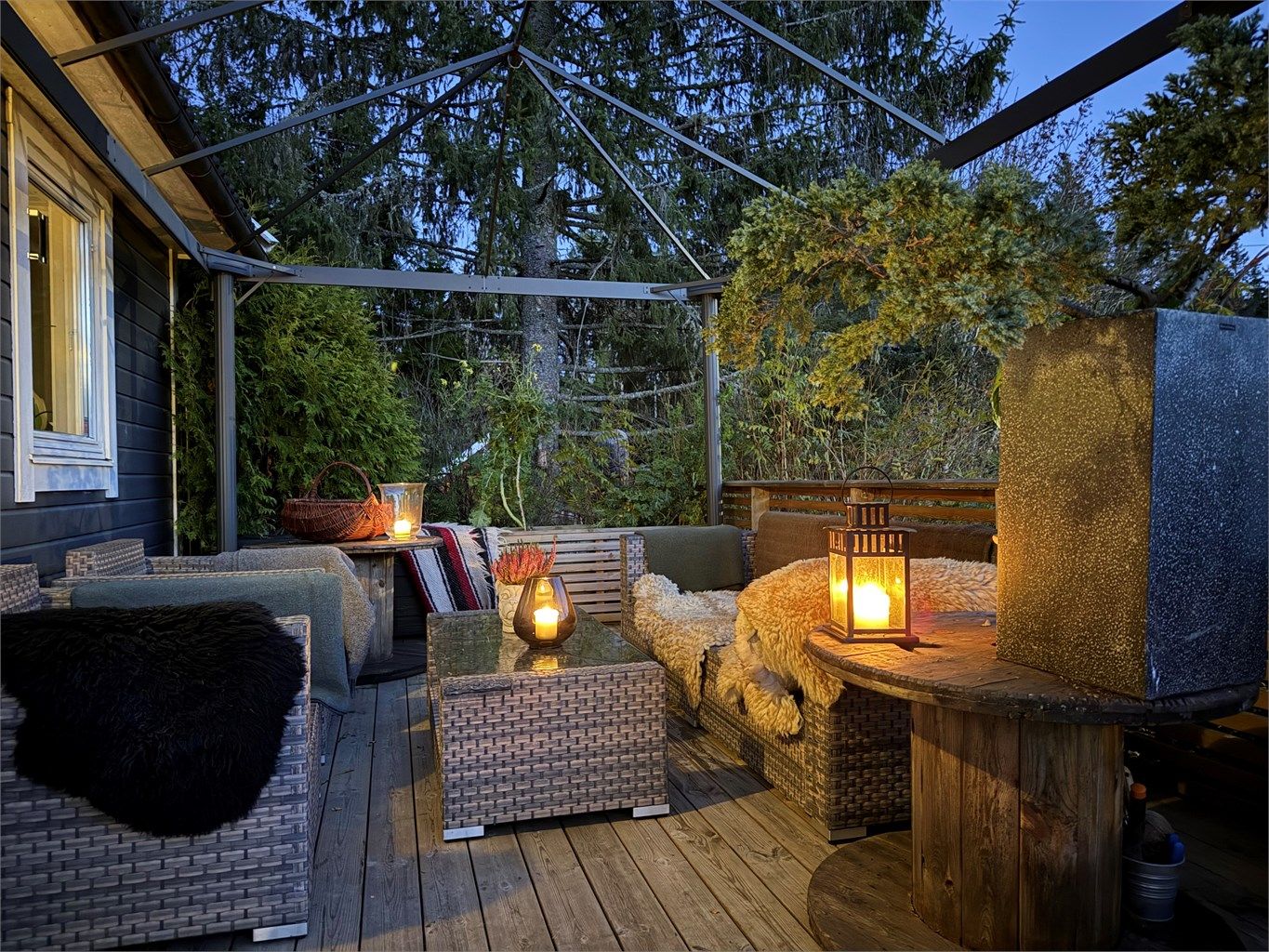 Hyggelig overbygget inngangsparti med plass til cafébord og stoler.