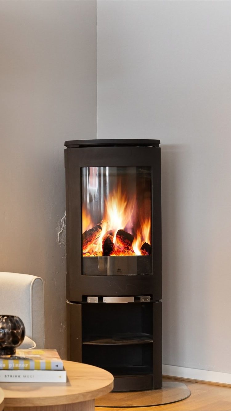 Oppvarming med elektrisitet. Vedovn i stue.