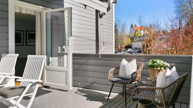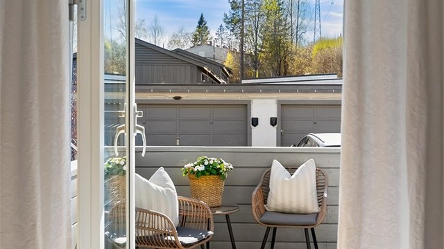 - Utgang fra stue til balkong på 12 m2. Balkong belagt med terrassebord. Rekkverk av treverk. Rekkverkshøyde er målt til 94 cm.