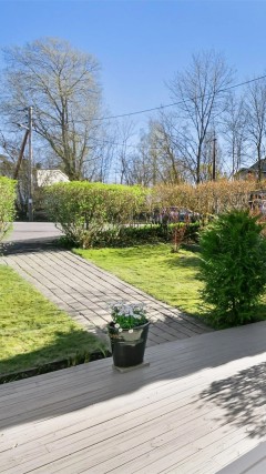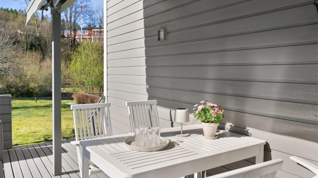 - Utgang fra entré til markterrasse på 8 m2. Markterrasse belagt med terrassebord.