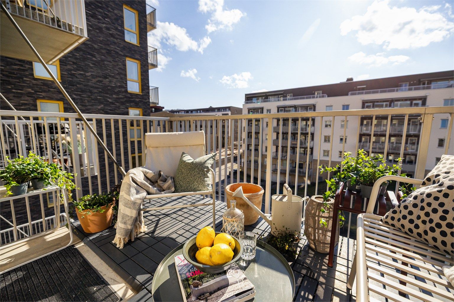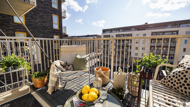 Fra stuen er det utgang til en sydøstvendt balkong på ca. 6 m². Balkongen har plass til sittegruppe og fungerer som en naturlig forlengelse av stuen i sommerhalvåret. Her kan du nyte gode solforhold på formiddagen i rolige omgivelser.