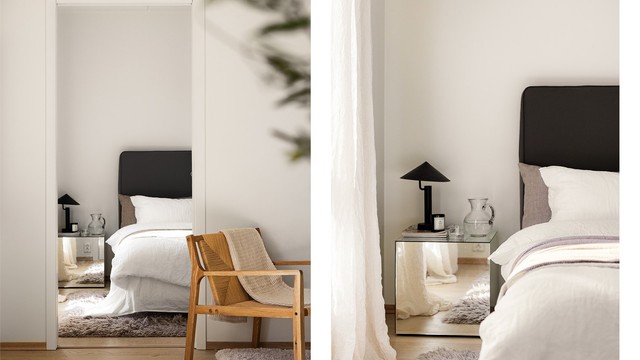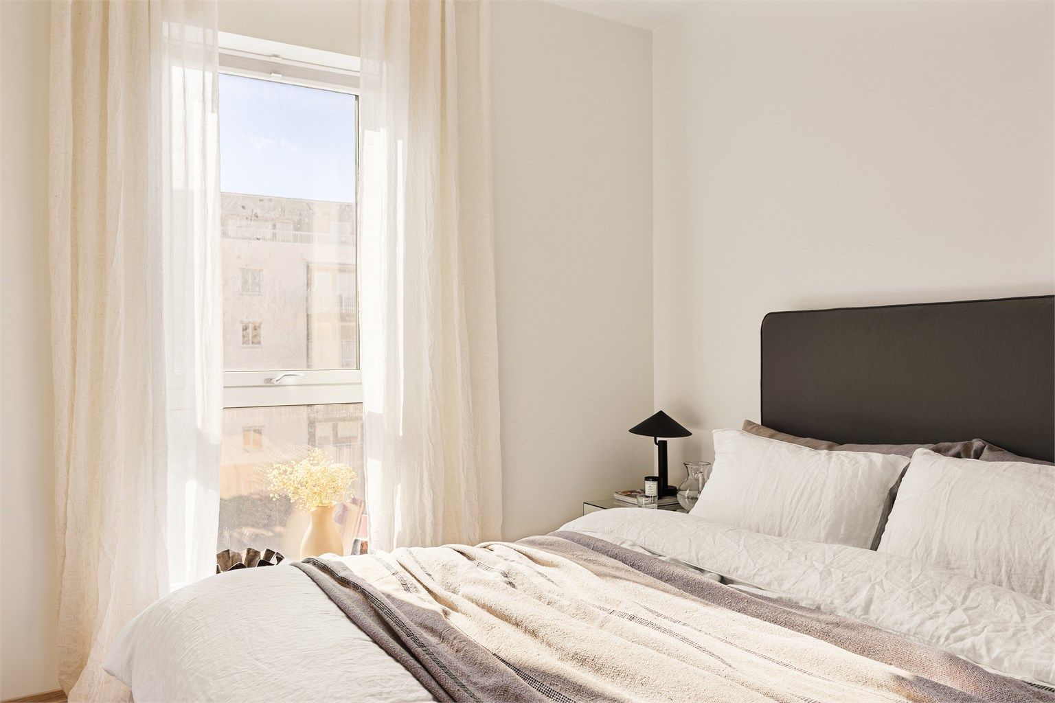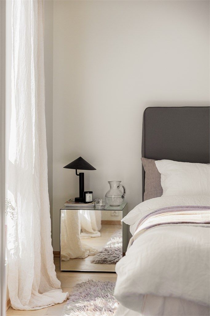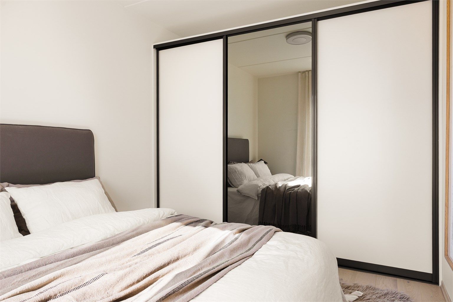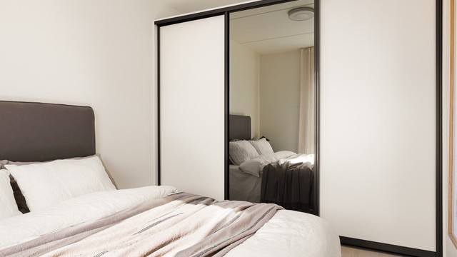 Soverommet er lyst og behagelig, med plass til dobbeltseng og tilhørende møbler. Et heldekkende garderobeskap med skyvedører gir svært gode oppbevaringsmuligheter og bidrar til et ryddig og funksjonelt rom.