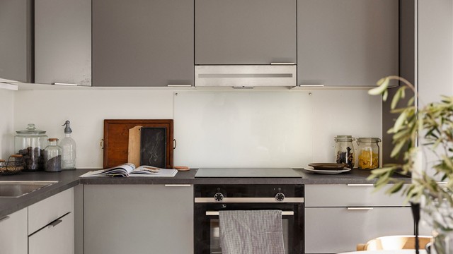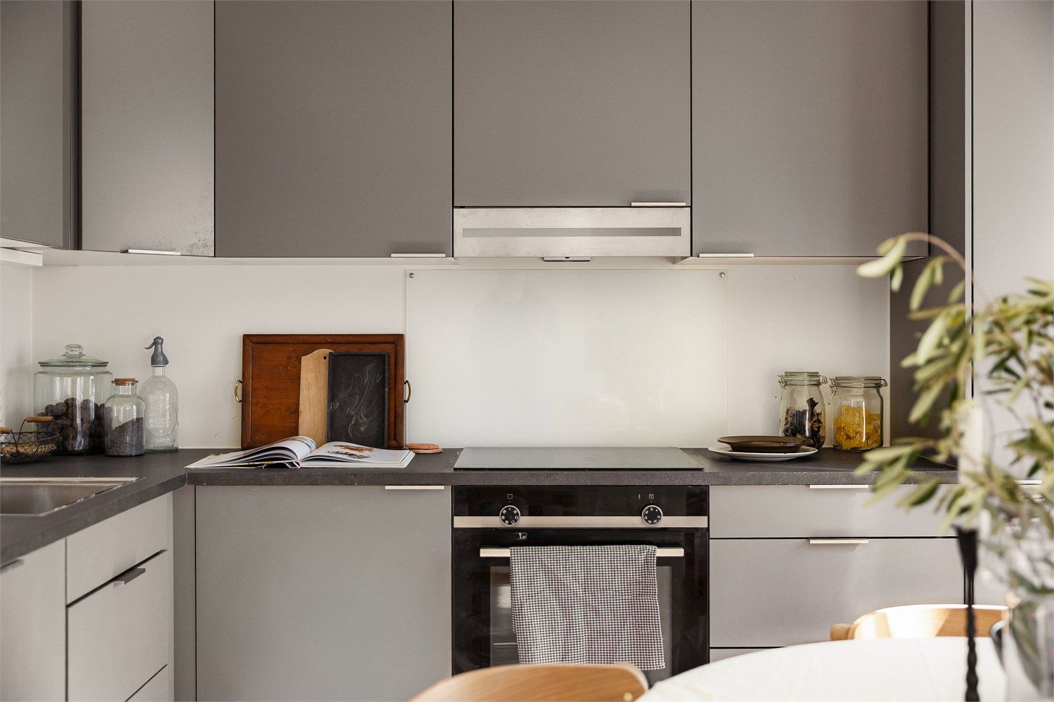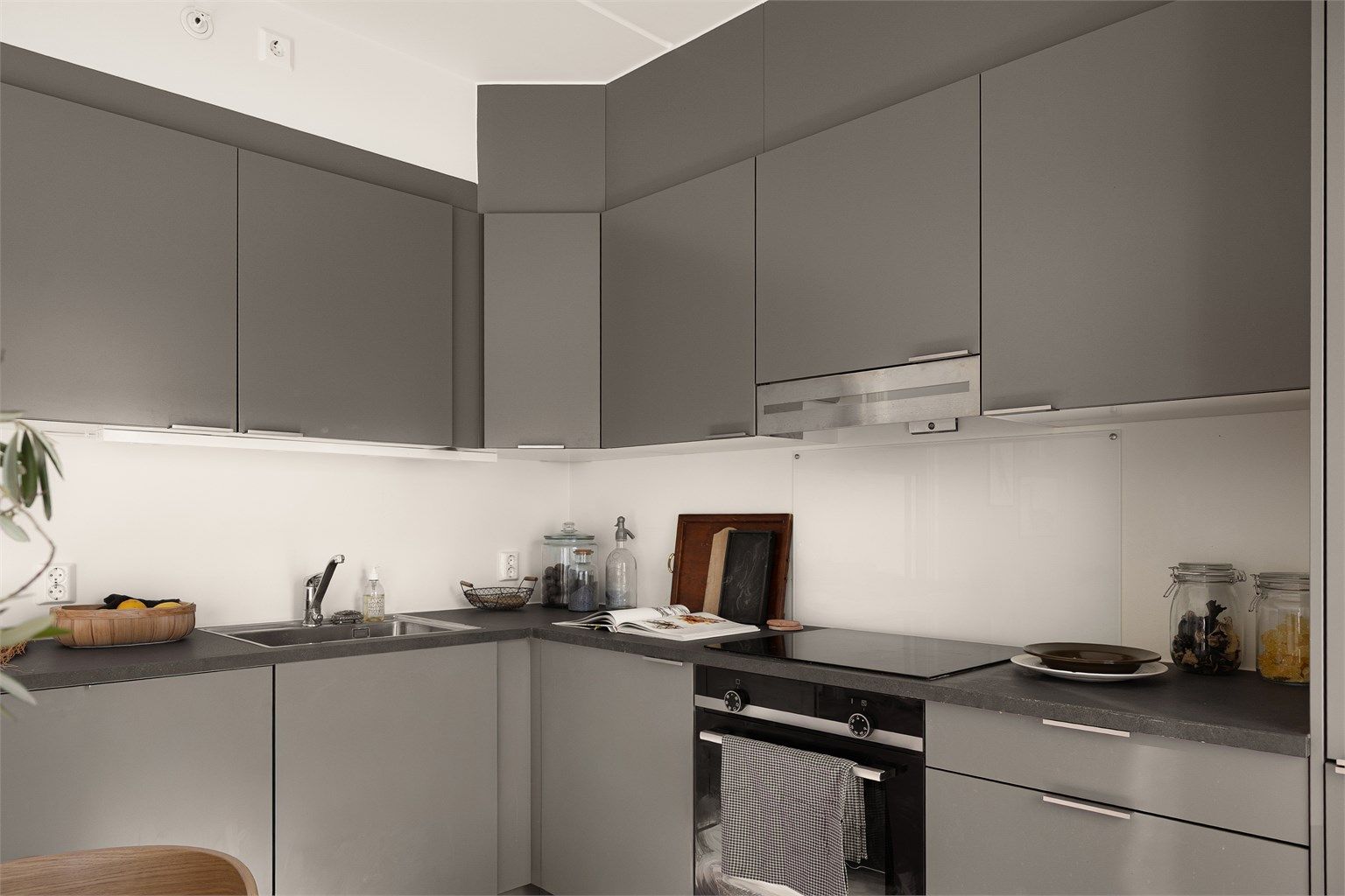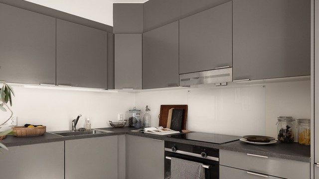 Kjøkkenet fra Norema har en stilren og praktisk hjørneløsning med glatte, grå fronter og gode arbeidsflater. Her er det rikelig med skap- og benkeplass, og alle hvitevarer er integrert for et helhetlig uttrykk – inkludert platetopp, stekeovn, oppvaskmaskin og kjøl-/fryseskap. Avtrekksviften er tilkoblet byggets balanserte ventilasjonsanlegg.