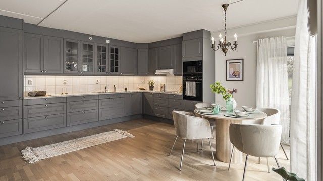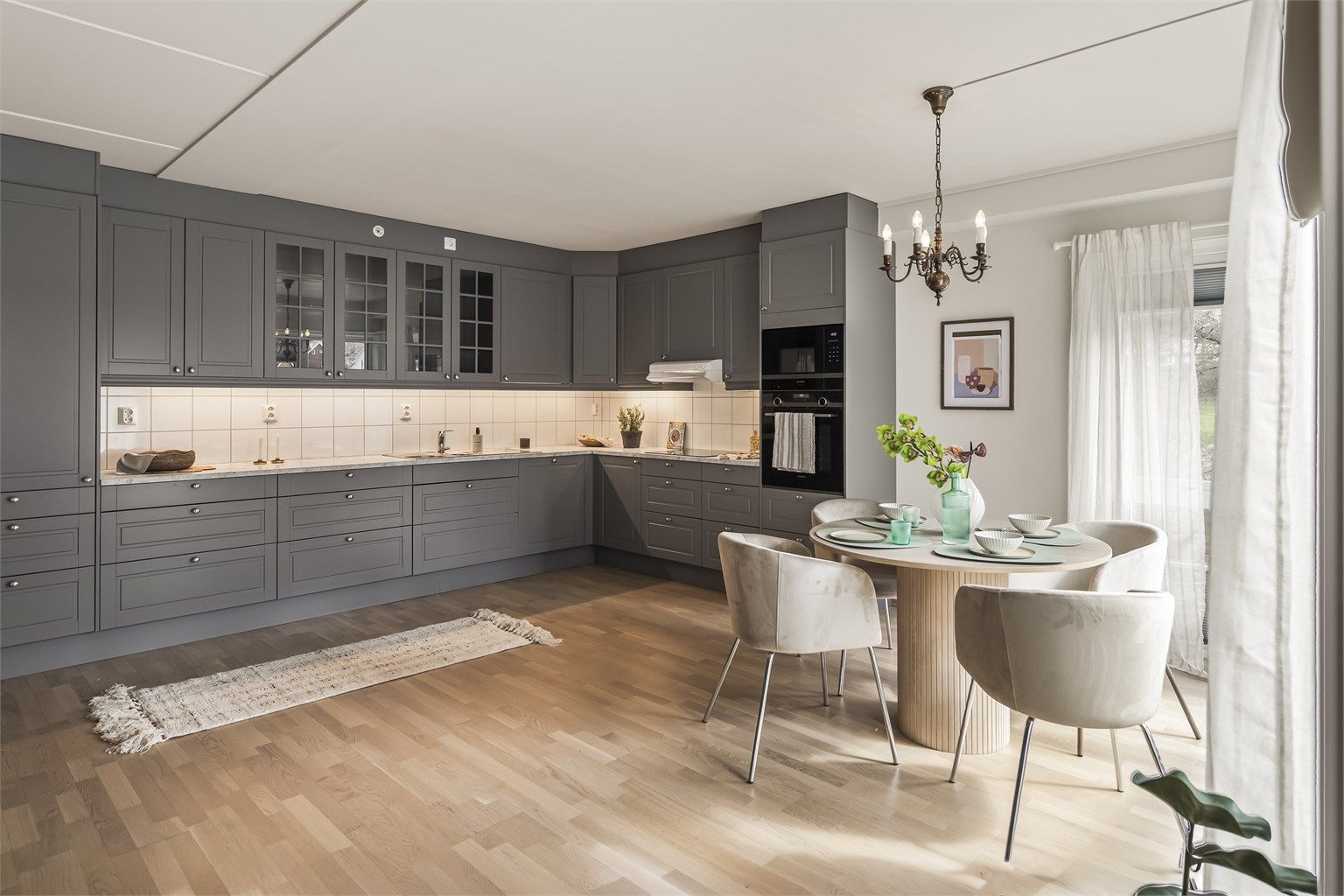 Kjøkkenet ble oppgradert og påkostet i forbindelse med byggingen. Innredningen er lys og delikat, med profilerte fronter og laminert benkeplate. Her er det rikelig med både skap, skuffer og benkeplass. Integrerte hvitevarer som oppvaskmaskin, induksjonstopp, stekeovn, mikrobølgeovn og kjøleskap medfølger. Det gjøres oppmerksom på at hvitevarene er kjøpt for noen år tilbake, og kjøper må forvente slitasje som følge alder og normal bruk.