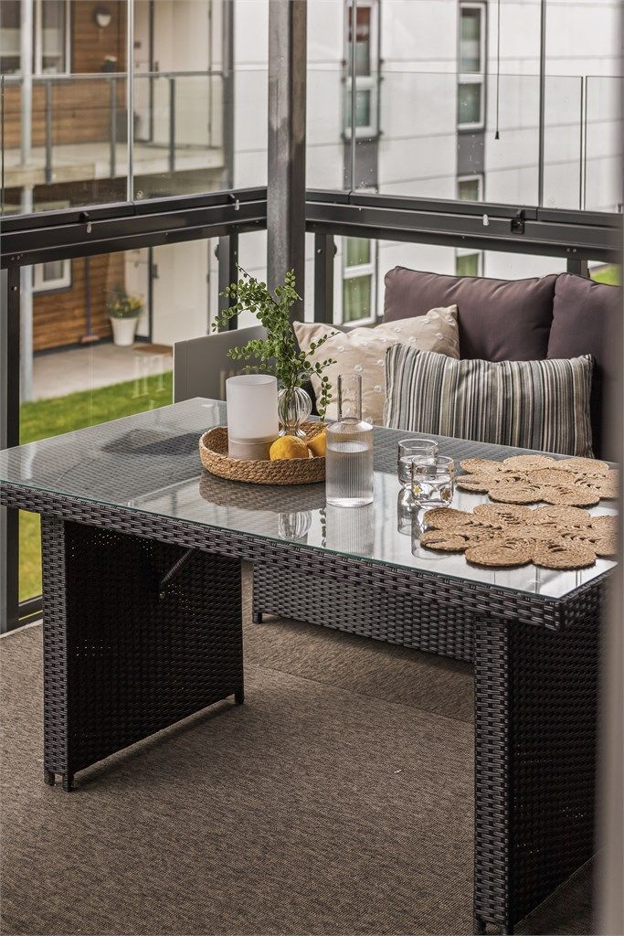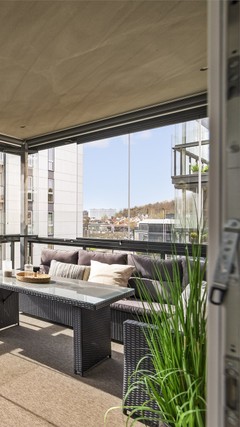- Innglasset balkong med varmeovner og utvendig solskjerming