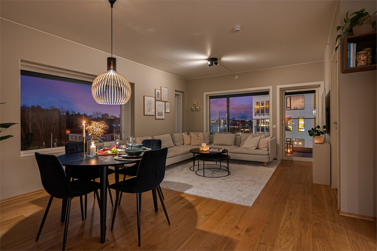 Store vindusflater i stue og kjøkken som gir en åpen og luftig romfølelse, samt ekstra vindu siden man ligger på enden av bygget