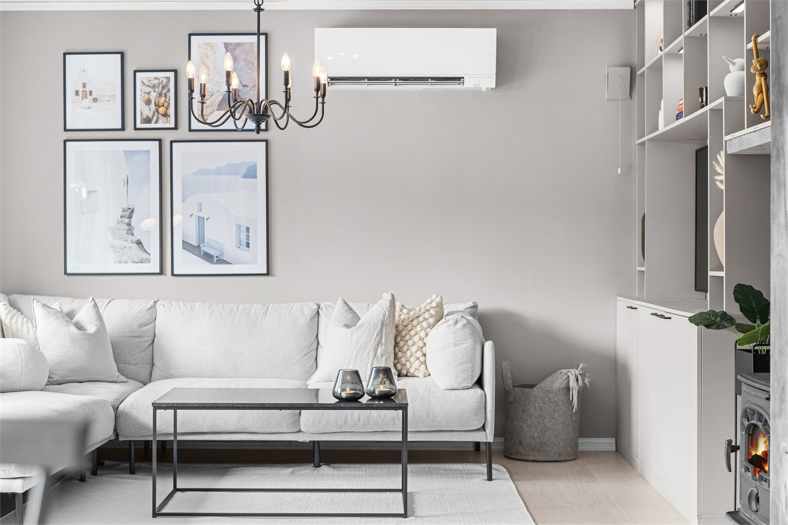 Montert luft-til-luft varmepumpe og peisovn i stuen.