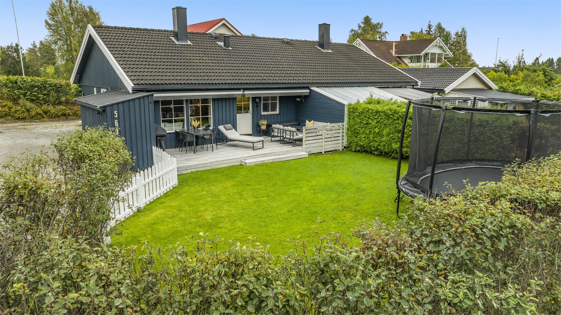 Tiltalende og arealeffektiv vertikaldelt tomannsbolig med en familievennlig planløsning over et plan med kjøkken, stue, tre soverom, bad og innvendig bod. Boligen holder en gjennomgående god standard og er godt ivaretatt. Kjøkken i åpen løsning mot stuen/spisestuen utgjør et koselig allrom med store vindusflater, lyse overflater og godt med naturlig lys. Fra stuen er det direkte utgang til solrik terrasse på 26 kvm. med to markiser. Videre utgang til inngjerdet hage med hekk, her er det god plass til barnelek og trampoline.