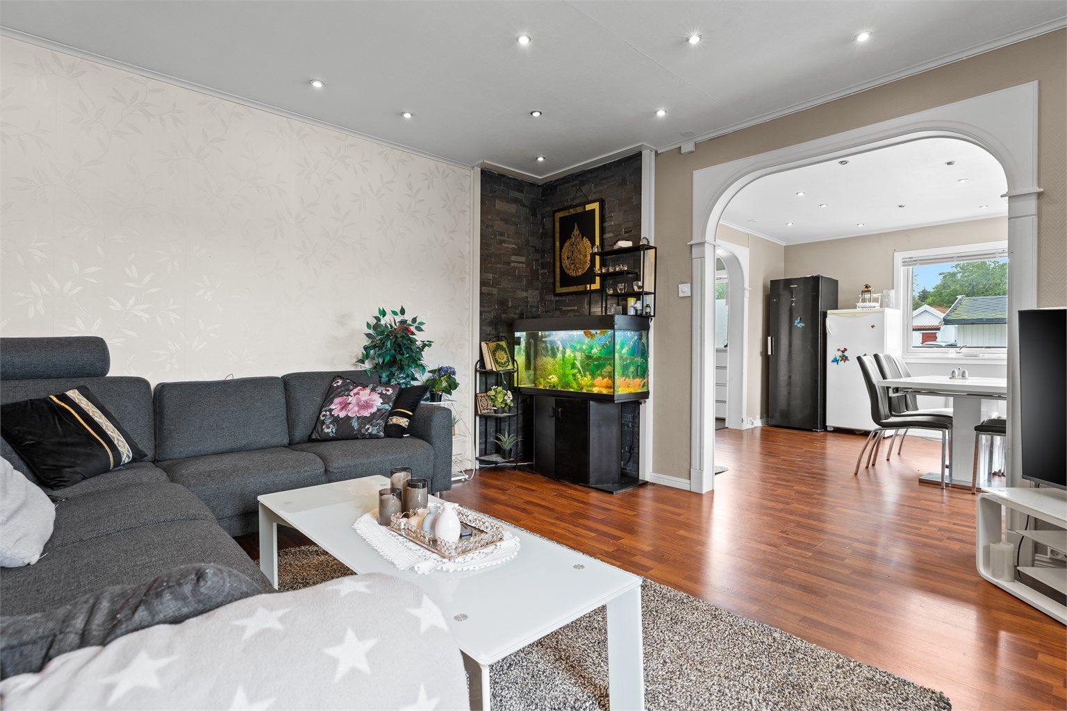 - Romslig stue med åpen løsning og fine detaljer gir en lun og trivelig atmosfære.