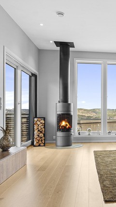 Elektrisk oppvarming. Peis i stue og varmepumpe i trappeoppgang.