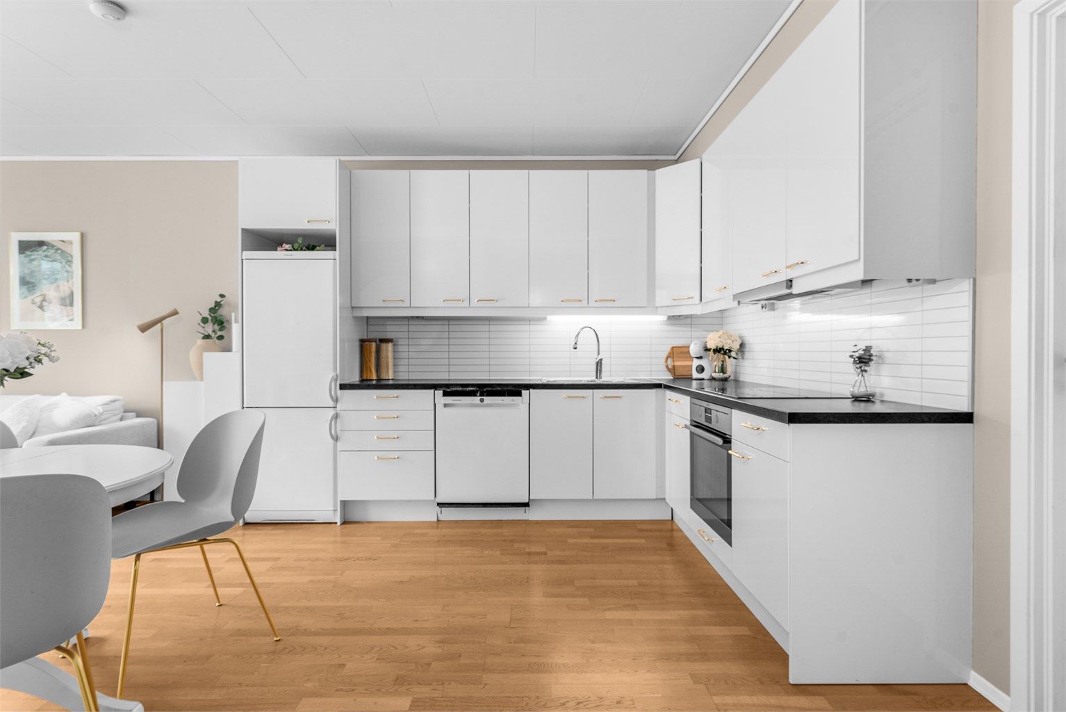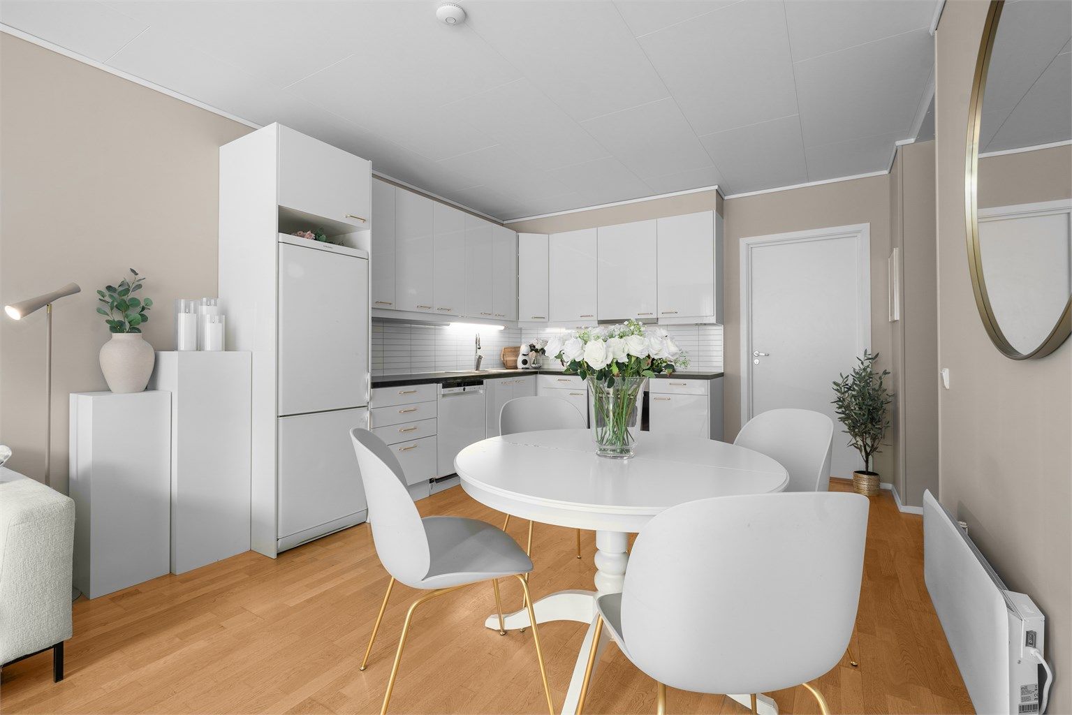 Det er kun de hvitevarene som er listet opp som følger med. Disse hvitevarene følger med: Kjøleskap og oppvaskmaskin.