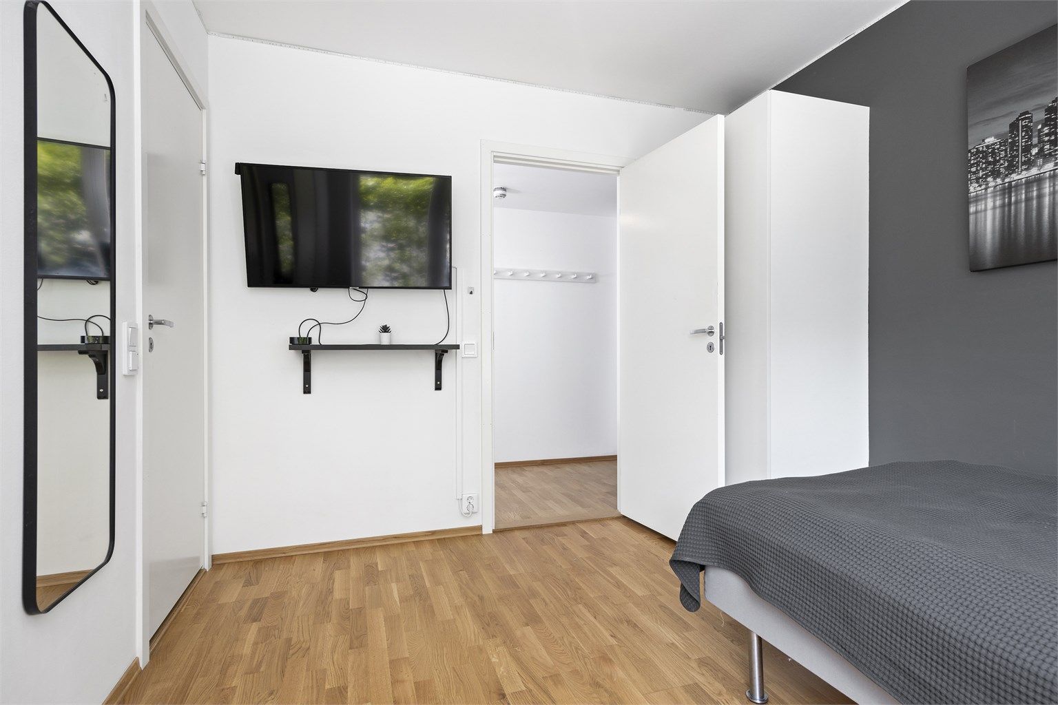 Godt med lagringsplass i stor skyvedørsgarderobe og enkelt skap. Parkett på gulv. Lysmalte vegg- og takfalter.