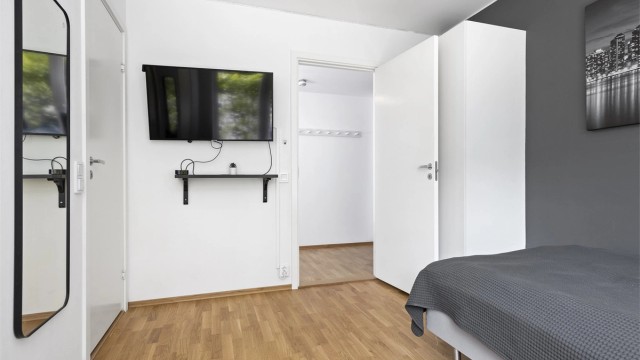 Rommet passer godt som barnerom, gjesterom eller kontor. Her er det plass til seng, skrivebord og skap. Rikelig med lysinnslipp fra stort vindu som vender mot balkong i sydvestvendt retning.