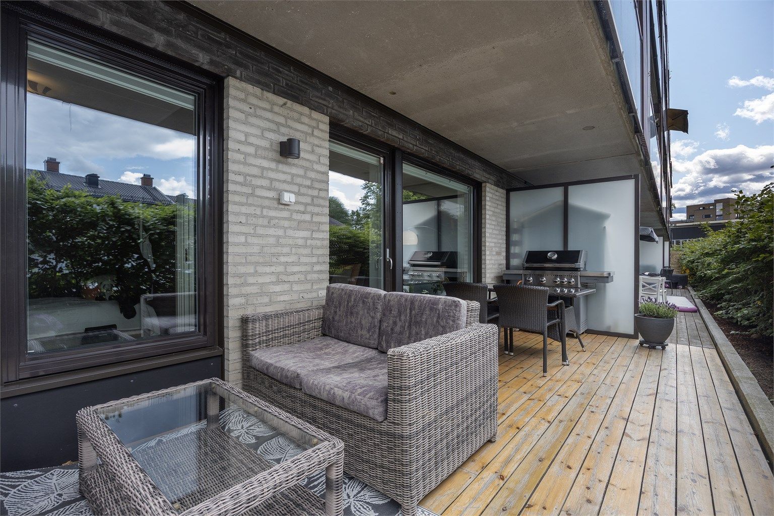 Terrassen er pent skjermet med busker og vender mot sameiets fellesområde.