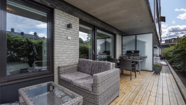 Stor og herlig nordøstvendt markterrasse på hele 19 m² med adkomst fra soverom I. På terrassen er det god plass til blant annet utemøbler og grill. Det er montert stikkontakt på vegg. Tredekke på gulv.