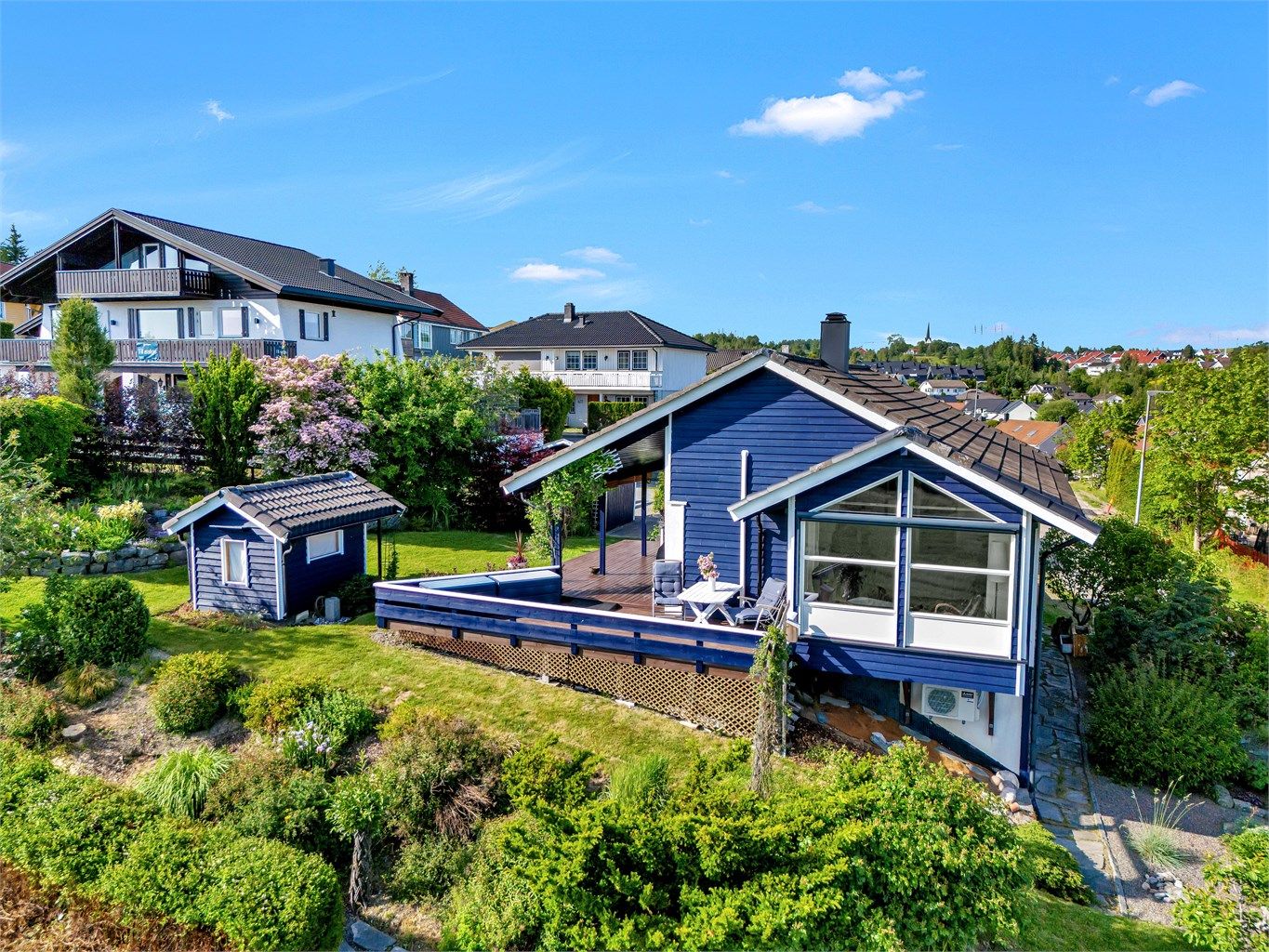 Her kan du nyte solrike dager, en fantastisk utsikt, frodig hage og hyggelige uteplasser.