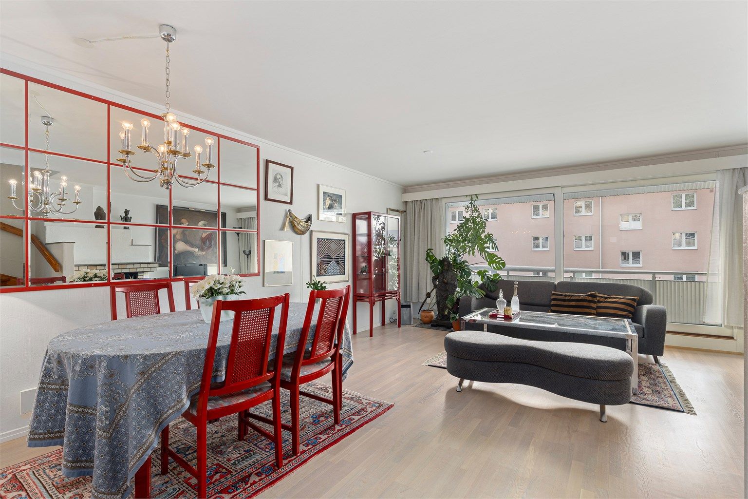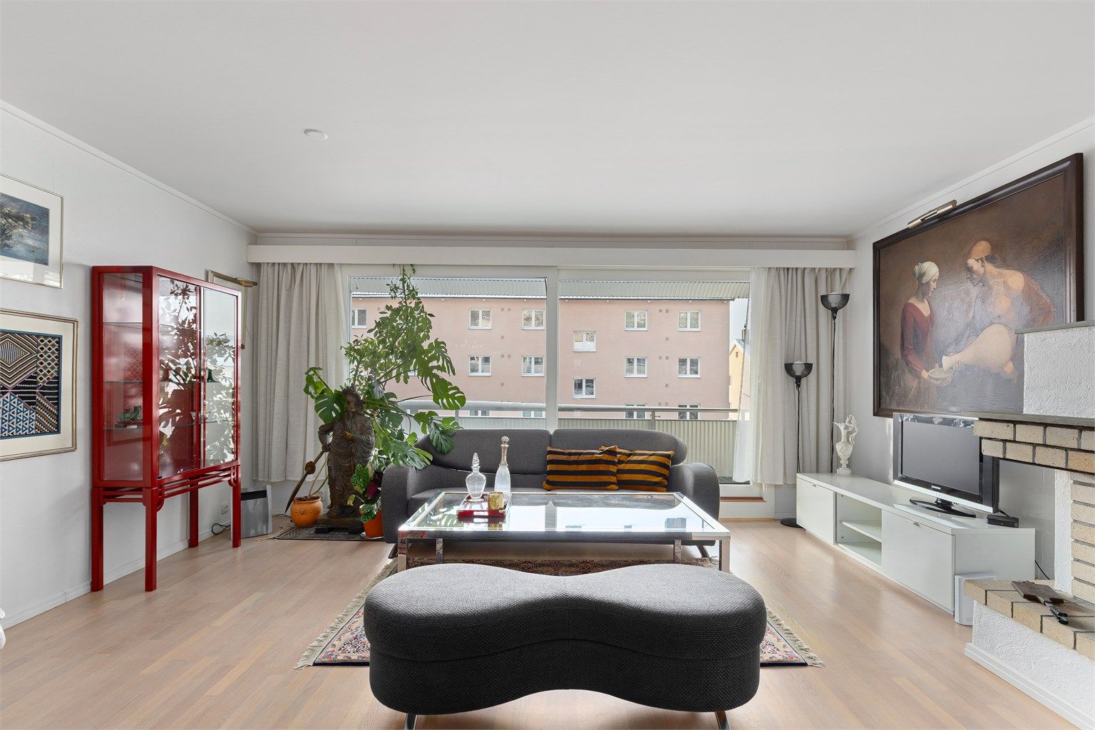 Selger opplyser at det er en flekk i parkett i hjørnet i stue som i dag er tildekket med en statue.