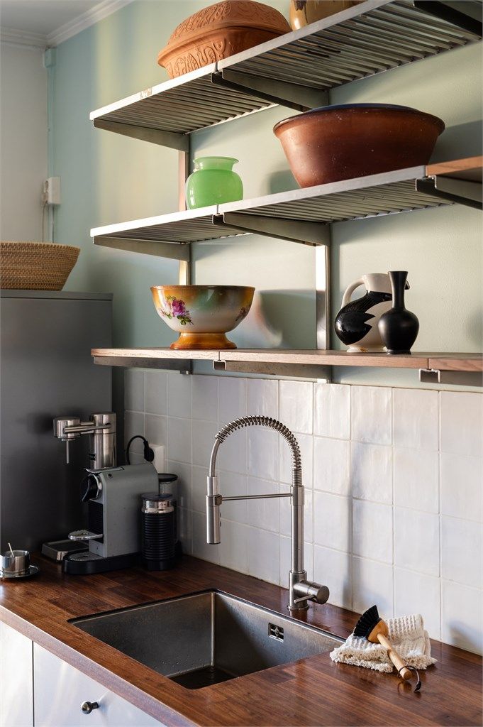 - Ny kjøkkeninnredning med metallfronter og heltre benkeplate. Installert lys i skuffer og skap på kjøkkenet.