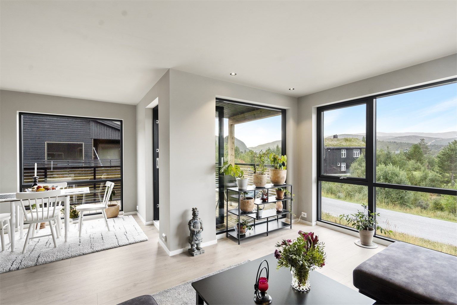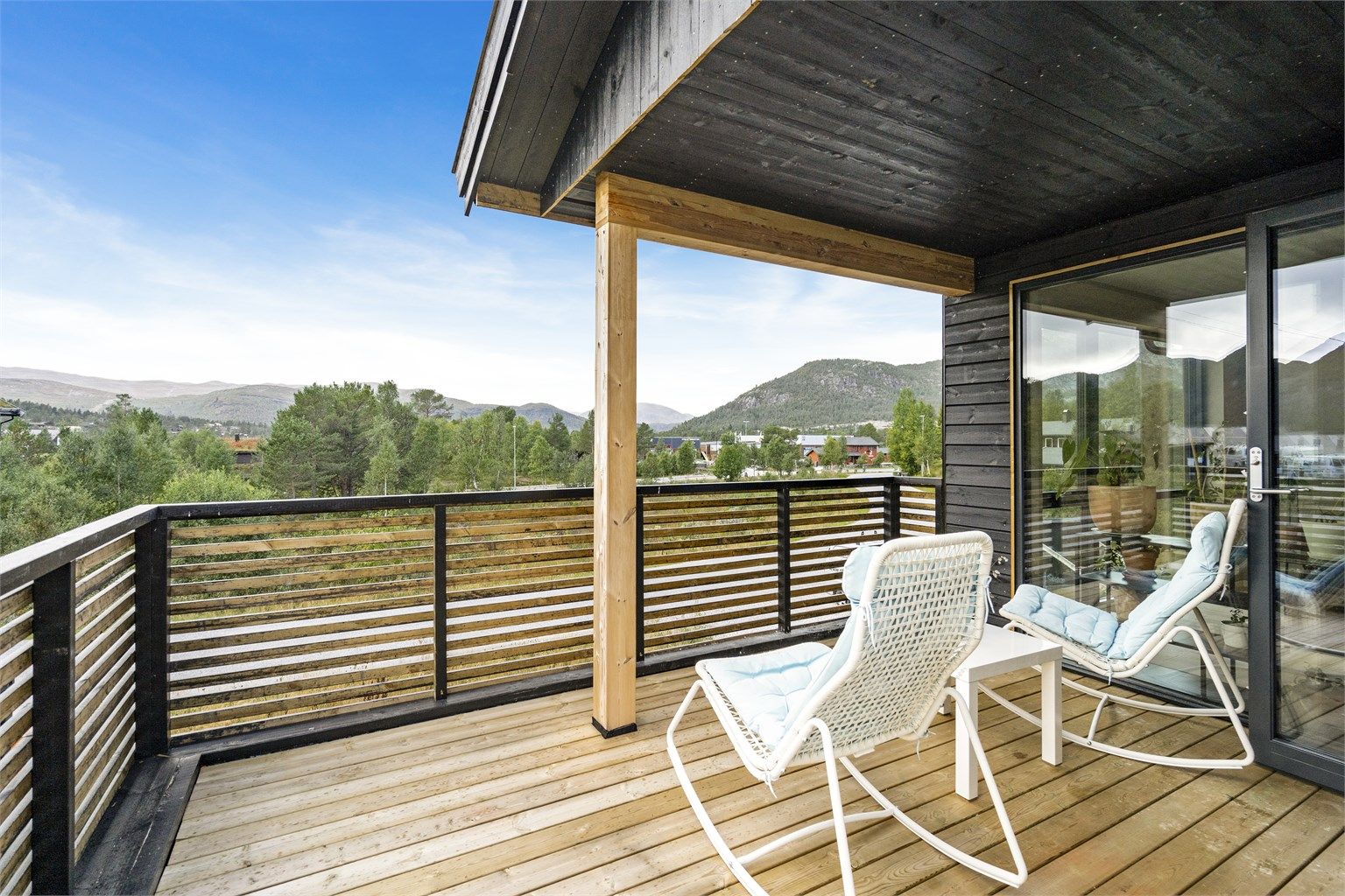 Fantastisk lys inne i huset, med sine store panoramavinduer og flott utsikt mot fjellene. God plass på balkongen, sol fra morgen til kveld. Stoor åpen stue og kjøkken med vedovn. Huset er nybygget og alt er nytt og frascht, inklusive hvitevarer. Huset er godt isolert og oppleves varm, samt holder godt på varmen.