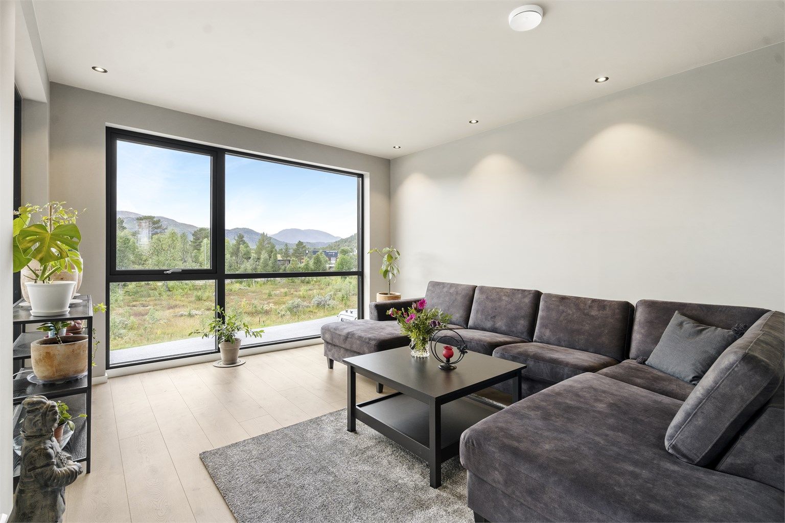 Nydelig utsikt fra eiendommen ut over Hovden og fjellene i vest. Store vindusflater sikrer godt med lys og utsikt fra stue og kjøkken.