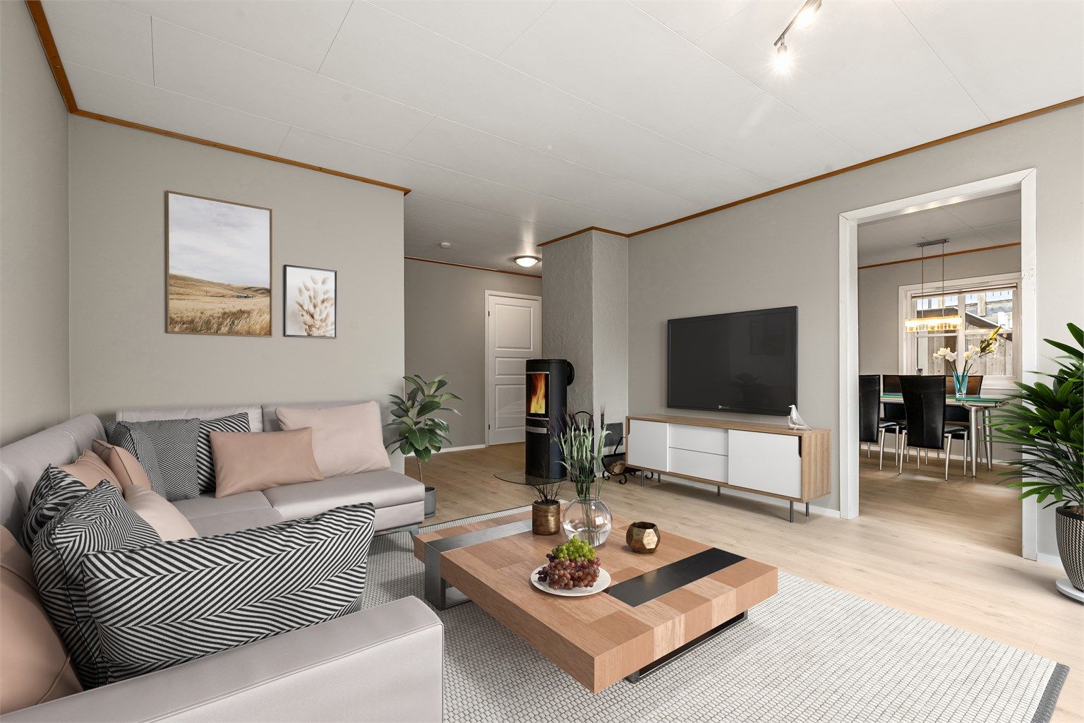 - Varmepumpe, 2023, og peis i stuen