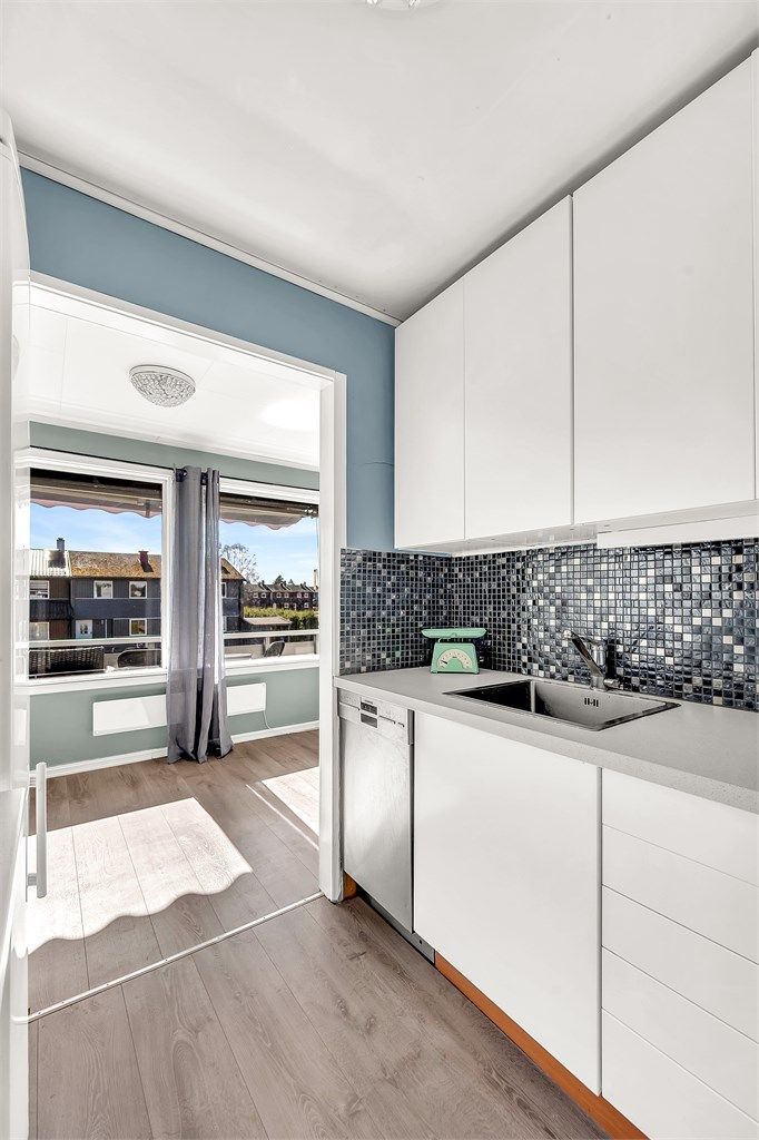 Pen 2-roms (+ alkove) selveierleilighet med solrik sørvendt balkong på 7 kvm - Sentrumsnær beliggenhet - Garasje.
