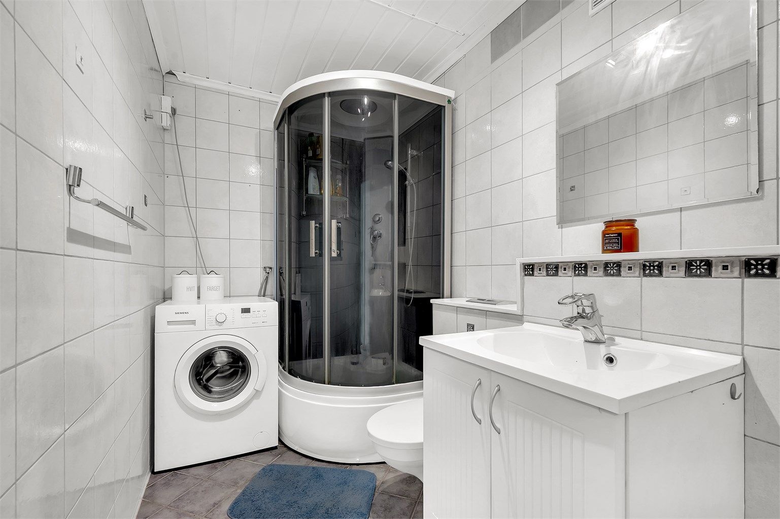 Misfarging påvist på fliser og flisfuger under dusjkabinett. For mer informasjon se s. 9 i tilstandsrapporten.