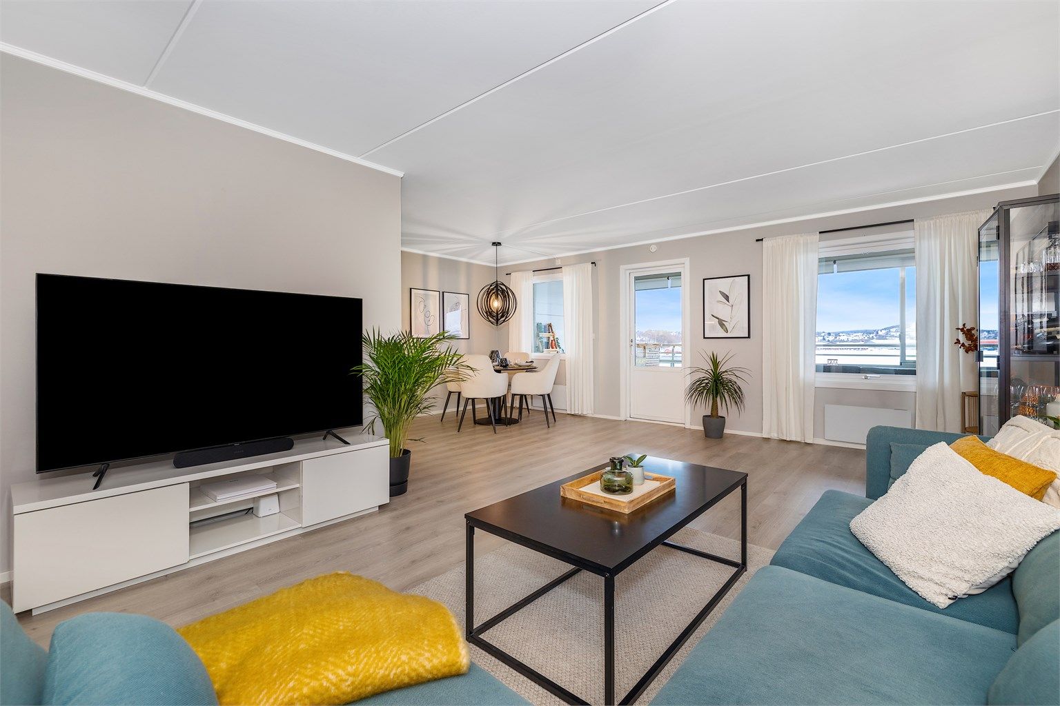 Stue har godt lysinnfall og har plass til både spisebord og sofagruppe.